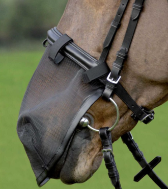 Fluenet til beskyttelse af hestens mule. Monteres på trense eller grime med de tynde velcro stropper. Farve: sort.