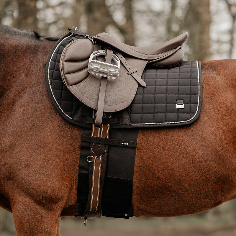 Mavebeskytteren forhindrer gnaven på hestens hud. Ideel til klippede heste eller heste med følsom hud. Den fastgøres nemt til sadlen med klips foran.