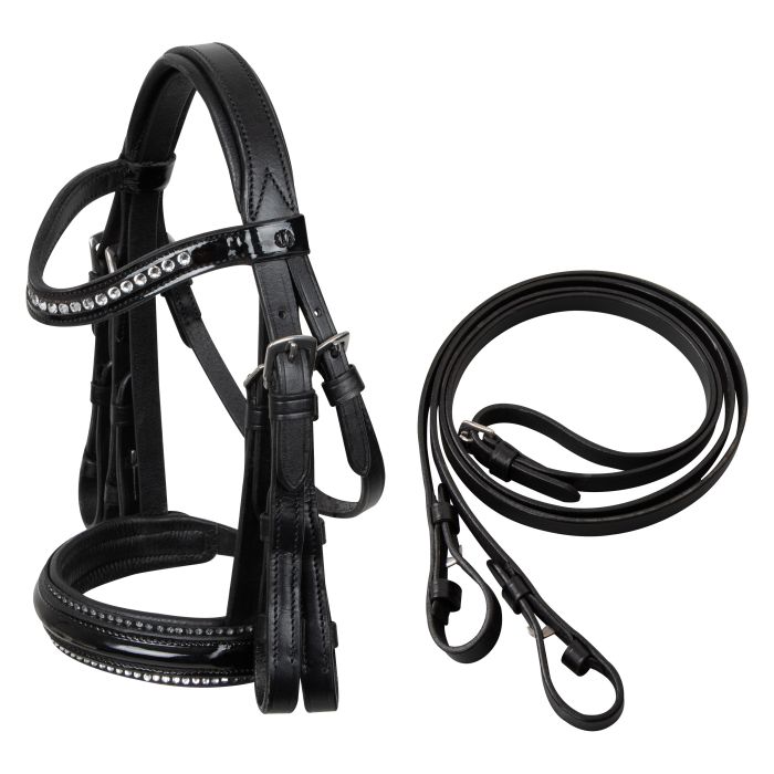 Denne trense er fremstillet af ægte læder. Det iøjnefaldende patenterede næsebånd, prydet med blændende rhinsten, kombineret med et funklende rhinstenspandebånd, sikrer, at du og din hestepartner virkelig vil skinne.