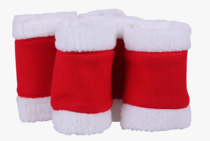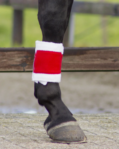 Sæt med 4 julebandager, der giver din hest en festlig vinterstemning. Lavet af rød fleece og foret med imiteret pels.