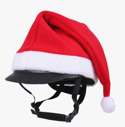 Denne julehue kan bæres ovn på en ridehjelm. Med hvid kant og hvid pompon.