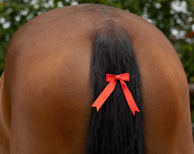 Rød sløjfe, der kan fastgøres i hestens hale for at advare andre ryttere om, at hesten kan sparke. Nem at fastgøre med en klips på bagsiden.