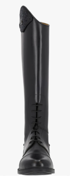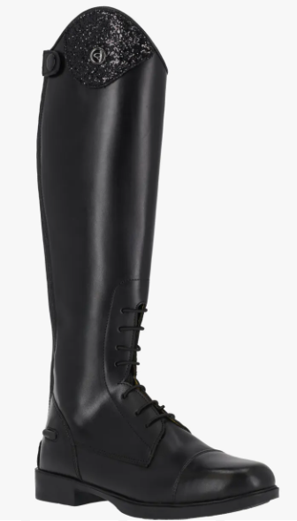 Tilpas denne ridestøvle til din stil! Toppen har en velcrolukning, så forskellige designs kan fastgøres til ridestøvlen. Ridestøvlen Romy har et glitterdesign. Andre designs fås separat. Ridestøvlen har en lynlås med elastikindlæg bagpå og en elastisk snøre foran.