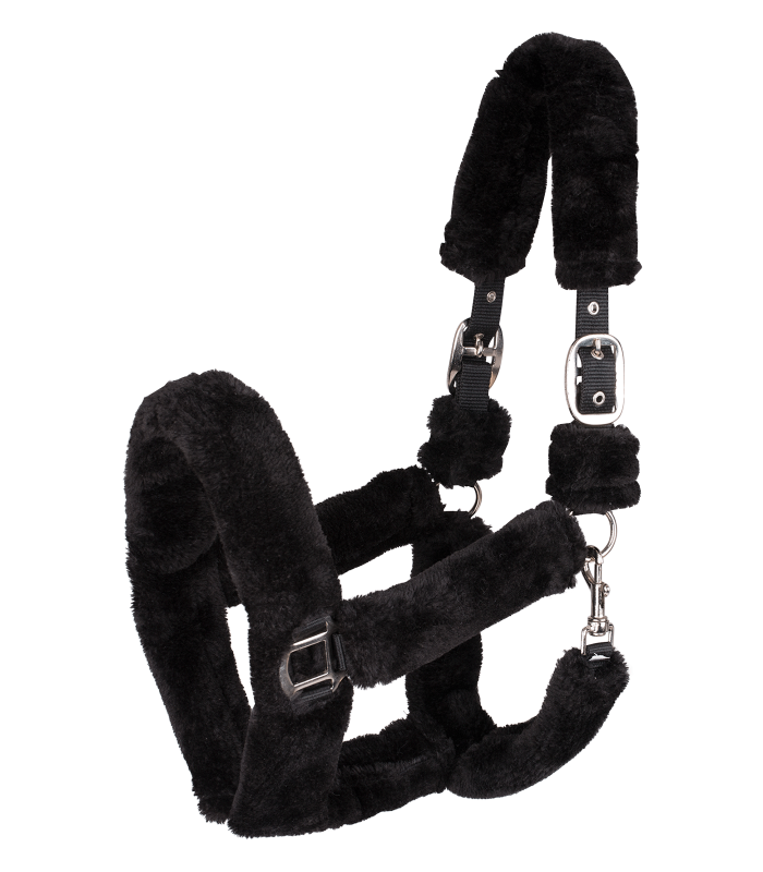 Plys grime dækket med blød syntetisk pels. Rigtig god til følsomme heste, f.eks. under transport. Justerbar i begge sider af nakkestykket.